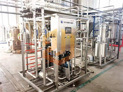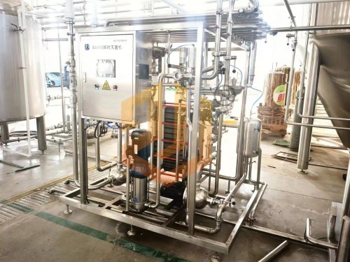啤酒殺菌時(shí)利用高壓啤酒泵送入二段式板式換熱器預(yù)熱段,與已完成殺菌的熱啤酒預(yù)加熱至62℃左右,再經(jīng)過高溫保溫段用85℃的熱水將啤酒加熱到78℃,在保溫管段保溫30秒后達(dá)到巴氏殺菌單位25pu值,然后再被預(yù)熱的冷啤酒降溫至4℃,進(jìn)入緩沖罐準(zhǔn)備灌裝。板式殺菌機(jī)組采用高精度的數(shù)控調(diào)節(jié),自動控制和安全保護(hù)措施,并可與CIP系統(tǒng)配合進(jìn)行設(shè)備自動清洗。